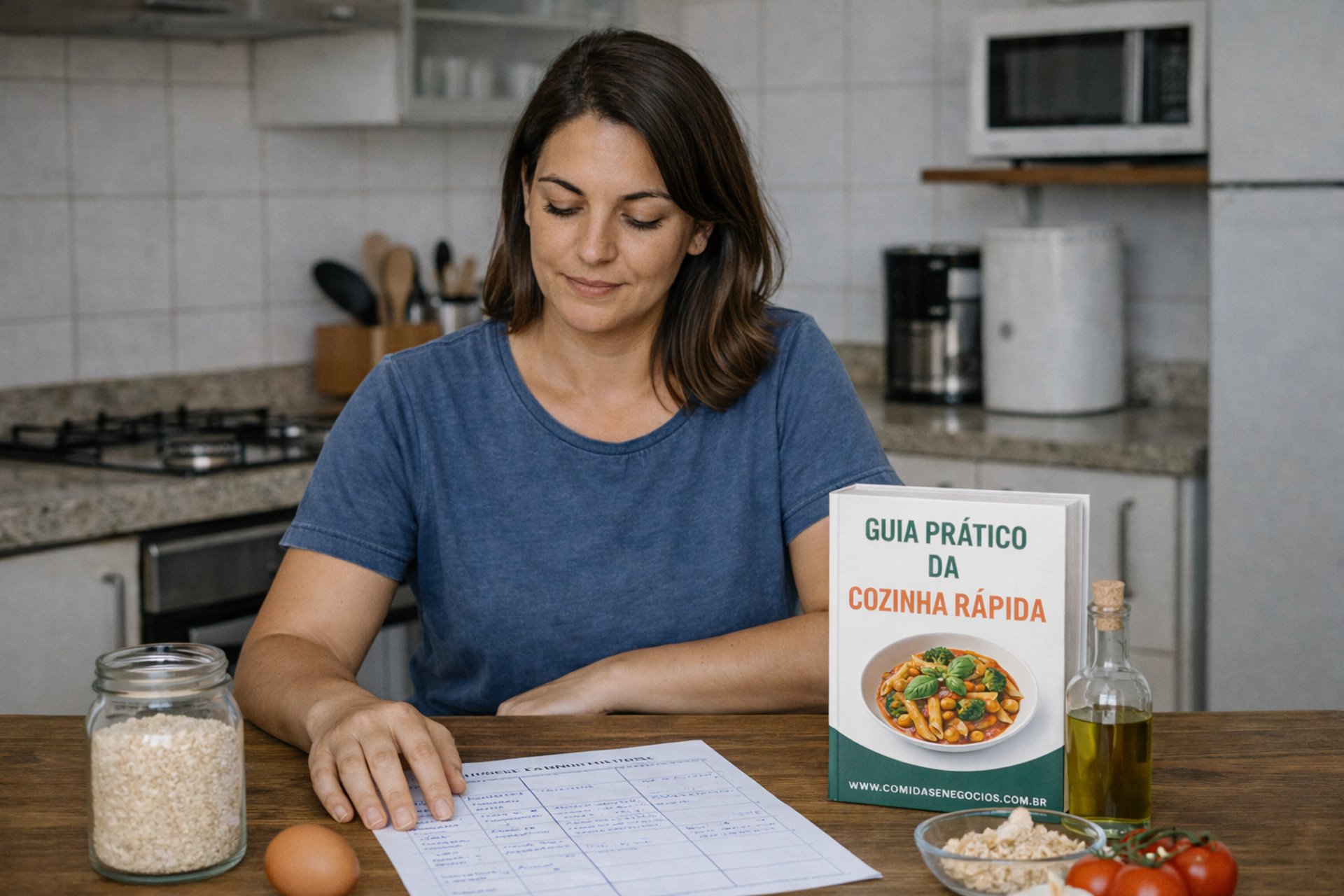 Foi pensando nisso que criei o Guia Prático de Cozinha Rápida, para mostrar como transformar ingredientes simples em pratos que cabem no seu tempo e no seu bolso.